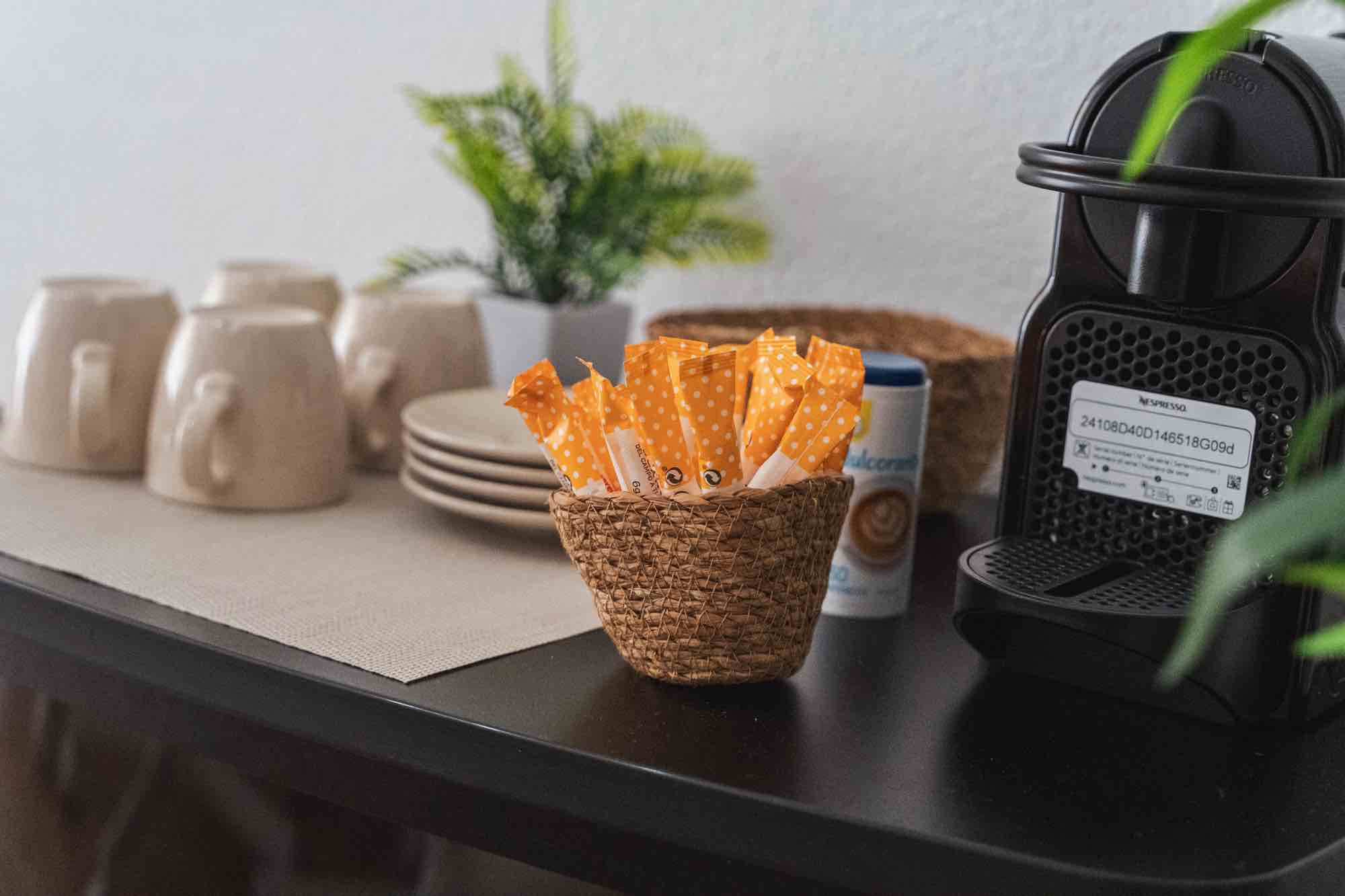 La zona de coworking, con grandes ventanales para aportar a ese espacio la luz suficiente para tu trabajo diario, dispone de una gran mesa con enchufes para que cargues tu PC o dispositivos y sillas de ruedas. Café de cortesía, y zona de impresión, con impresora, papel y material de oficina. Junto a la ventana 2 sofás individuales y una mesa para tus descansos disfrutando de las vistas al jardín.