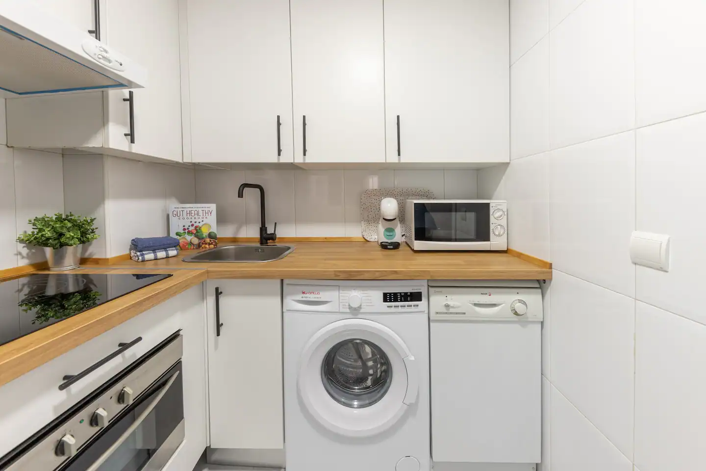 Este apartamento completamente amueblado proporciona todas las comodidades necesarias para una estancia confortable, incluyendo ropa de cama, toallas y utensilios de cocina. El dormitorio cuenta con un armario empotrado con cajones para un fácil almacenamiento.