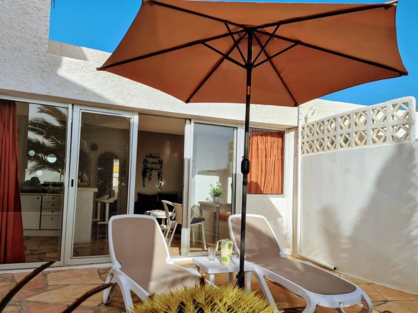 Desde la sala de estar también tienes acceso directo a la hermosa terraza. La terraza ofrece unas vistas impresionantes y cuenta con dos tumbonas, ideales para disfrutar del clima suave de Fuerteventura durante todo el año.