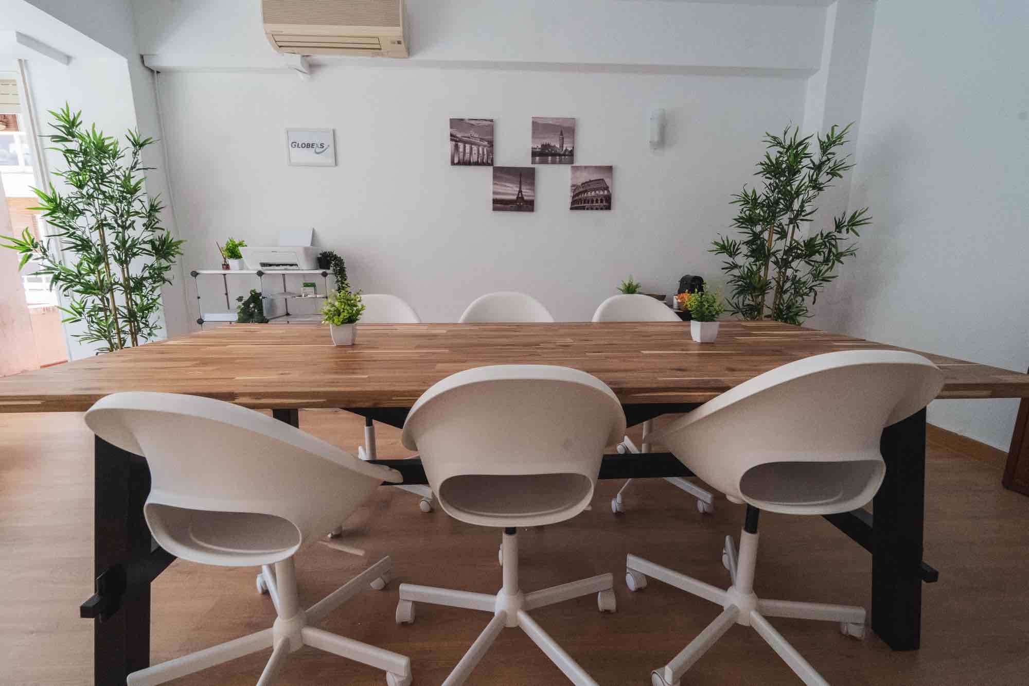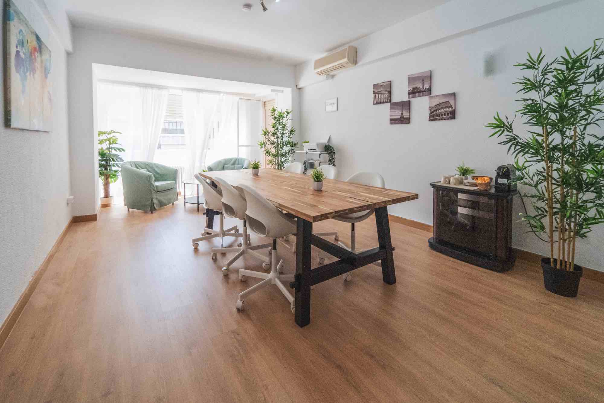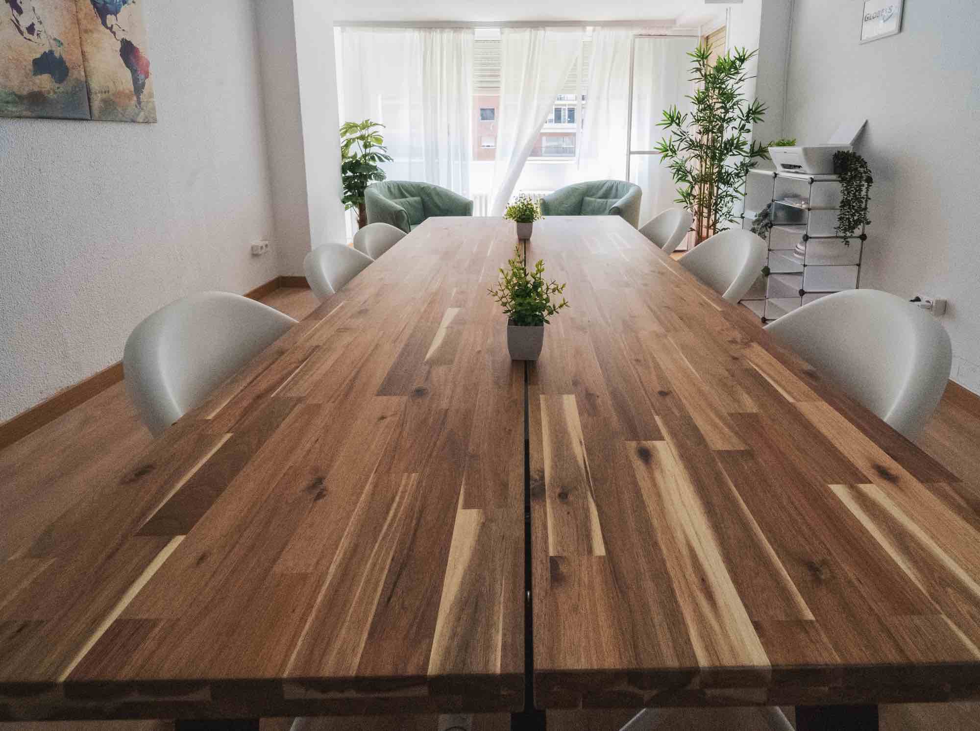 La zona de coworking, con grandes ventanales para aportar a ese espacio la luz suficiente para tu trabajo diario, dispone de una gran mesa con enchufes para que cargues tu PC o dispositivos y sillas de ruedas. Café de cortesía, y zona de impresión, con impresora, papel y material de oficina. Junto a la ventana 2 sofás individuales y una mesa para tus descansos disfrutando de las vistas al jardín.