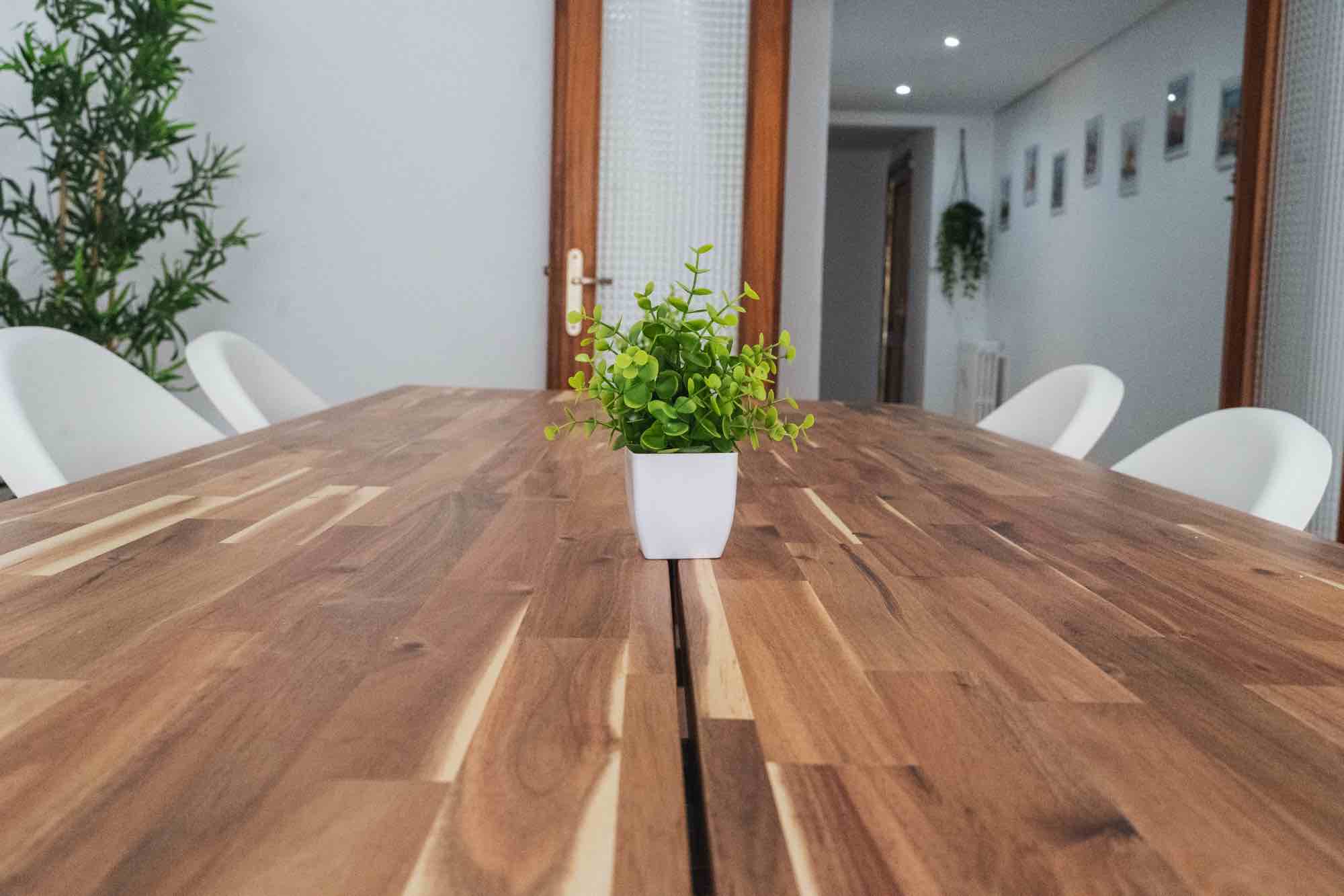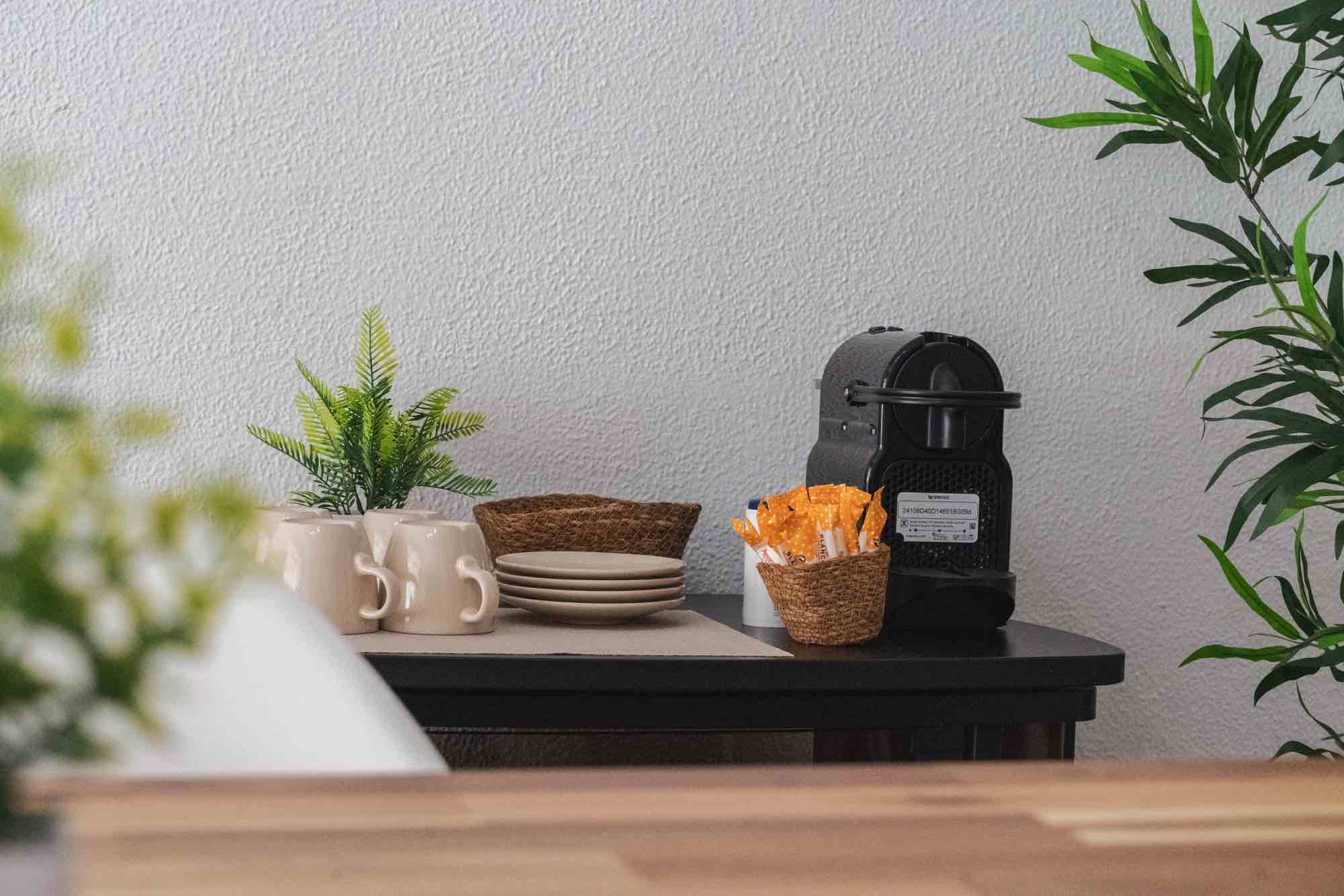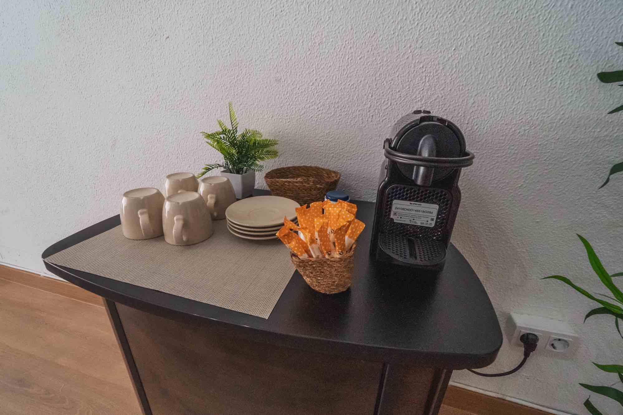 La zona de coworking, con grandes ventanales para aportar a ese espacio la luz suficiente para tu trabajo diario, dispone de una gran mesa con enchufes para que cargues tu PC o dispositivos y sillas de ruedas. Café de cortesía, y zona de impresión, con impresora, papel y material de oficina. Junto a la ventana 2 sofás individuales y una mesa para tus descansos disfrutando de las vistas al jardín.