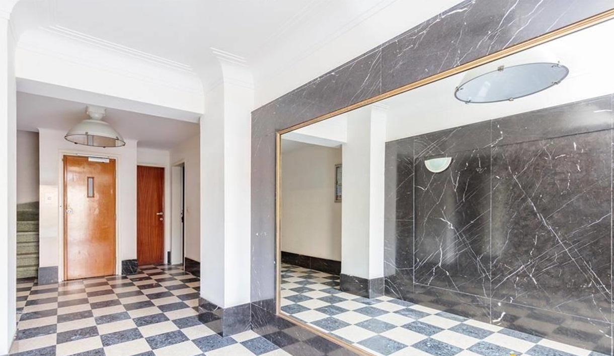 Caminamos por el pasillo donde una estatua de un asiento negro hace guardia en una consola. El segundo pasillo también está equipado con iluminación de emergencia. Hay un armario de almacenamiento con guardarropa, donde también se encuentran las técnicas. Aquí también encontramos acceso al baño.