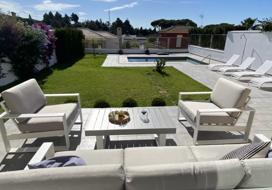 La magnífica terraza al aire libre es ideal para disfrutar del hermoso clima andaluz y organizar reuniones. Ubicada a solo 2000 metros de la reconocida Playa de La Barrosa, esta villa combina tranquilidad con acceso conveniente a playas de arena blanca, exquisitos restaurantes y emocionantes actividades al aire libre, convirtiéndola en el refugio perfecto para tu estancia en Chiclana de la Frontera.