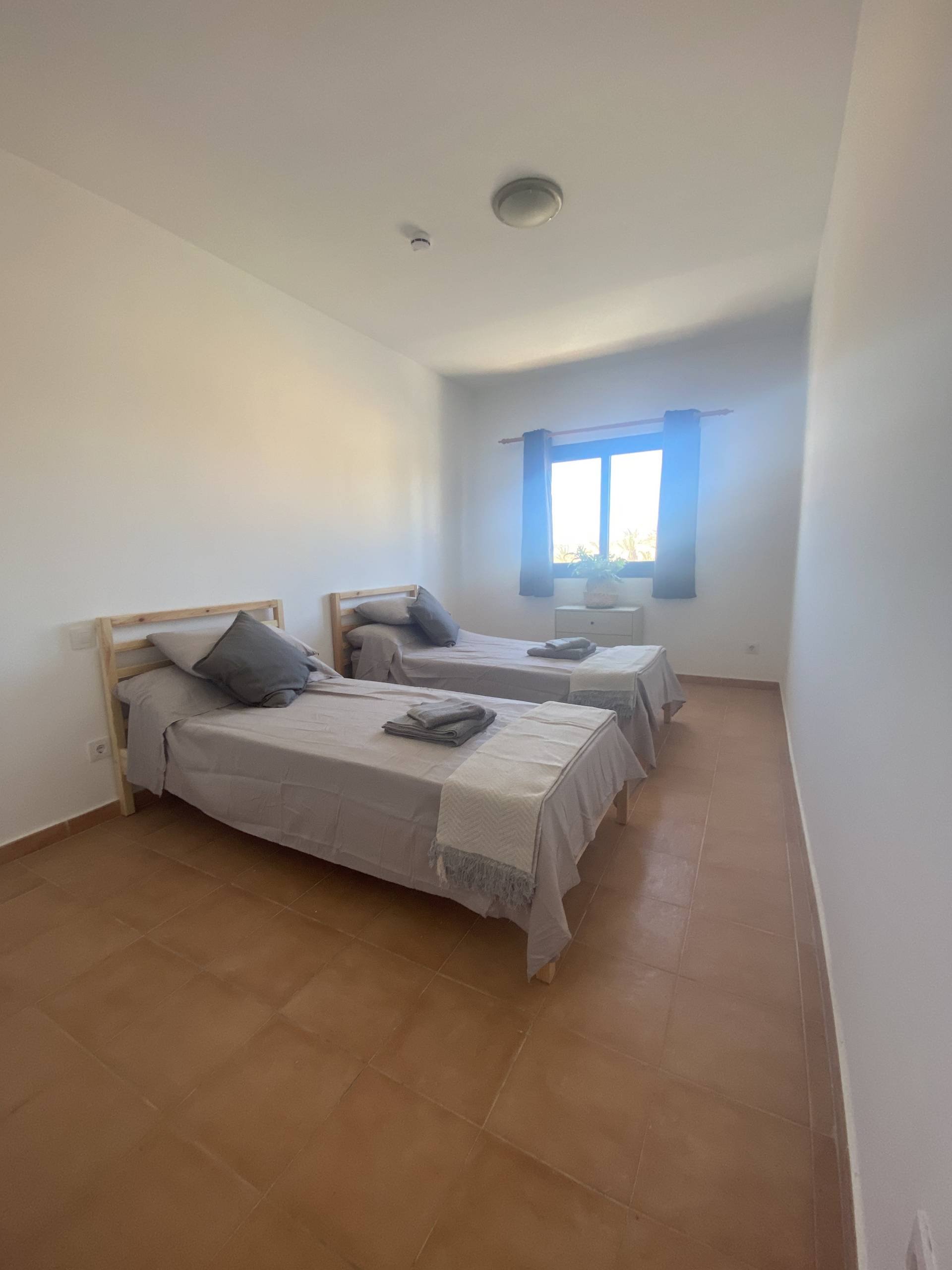 Es un piso con terraza y piscina en Costa Calma. Hay un dormitorio con dos camas individuales. El baño tiene una bañera, lavabo y, por supuesto, un inodoro.