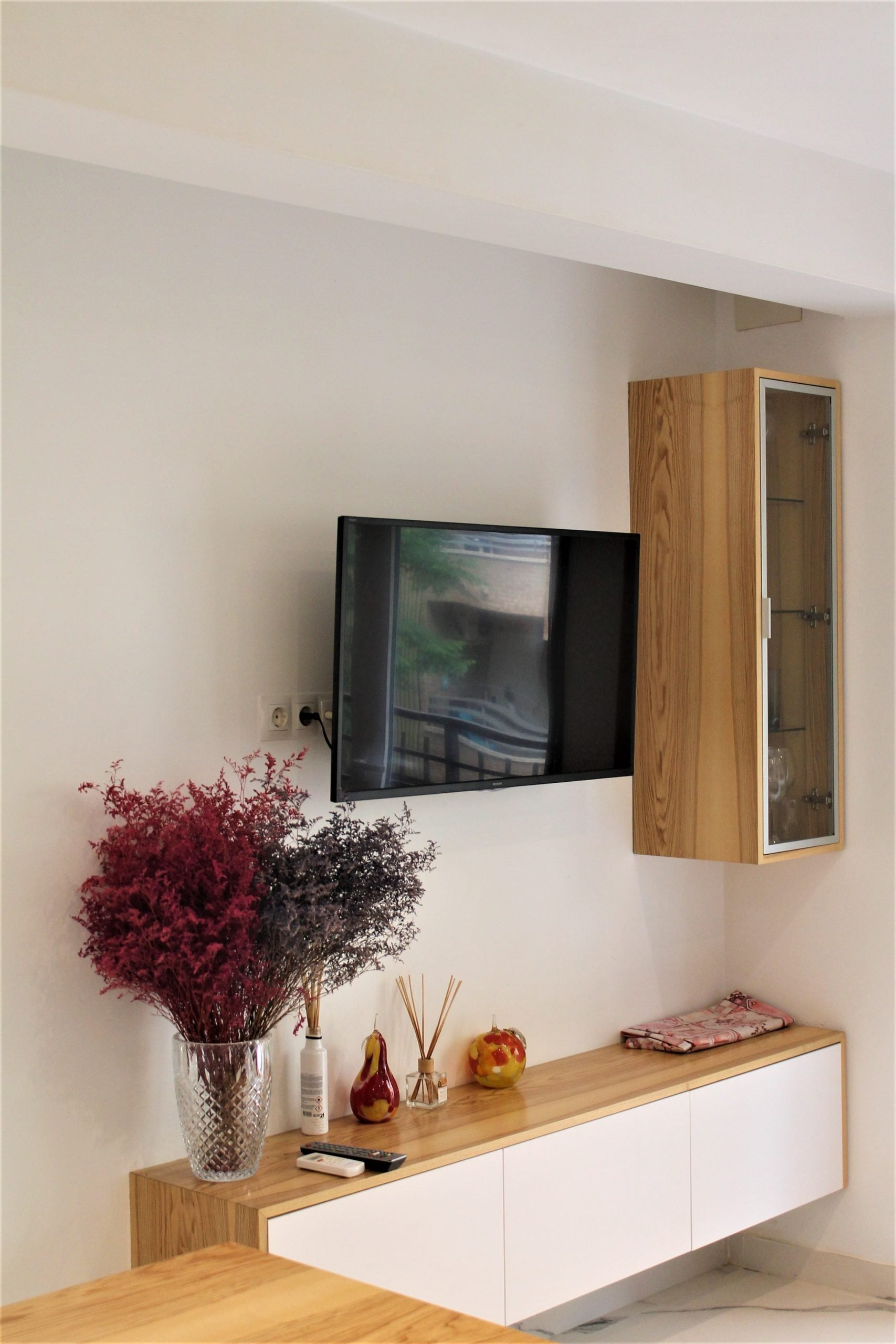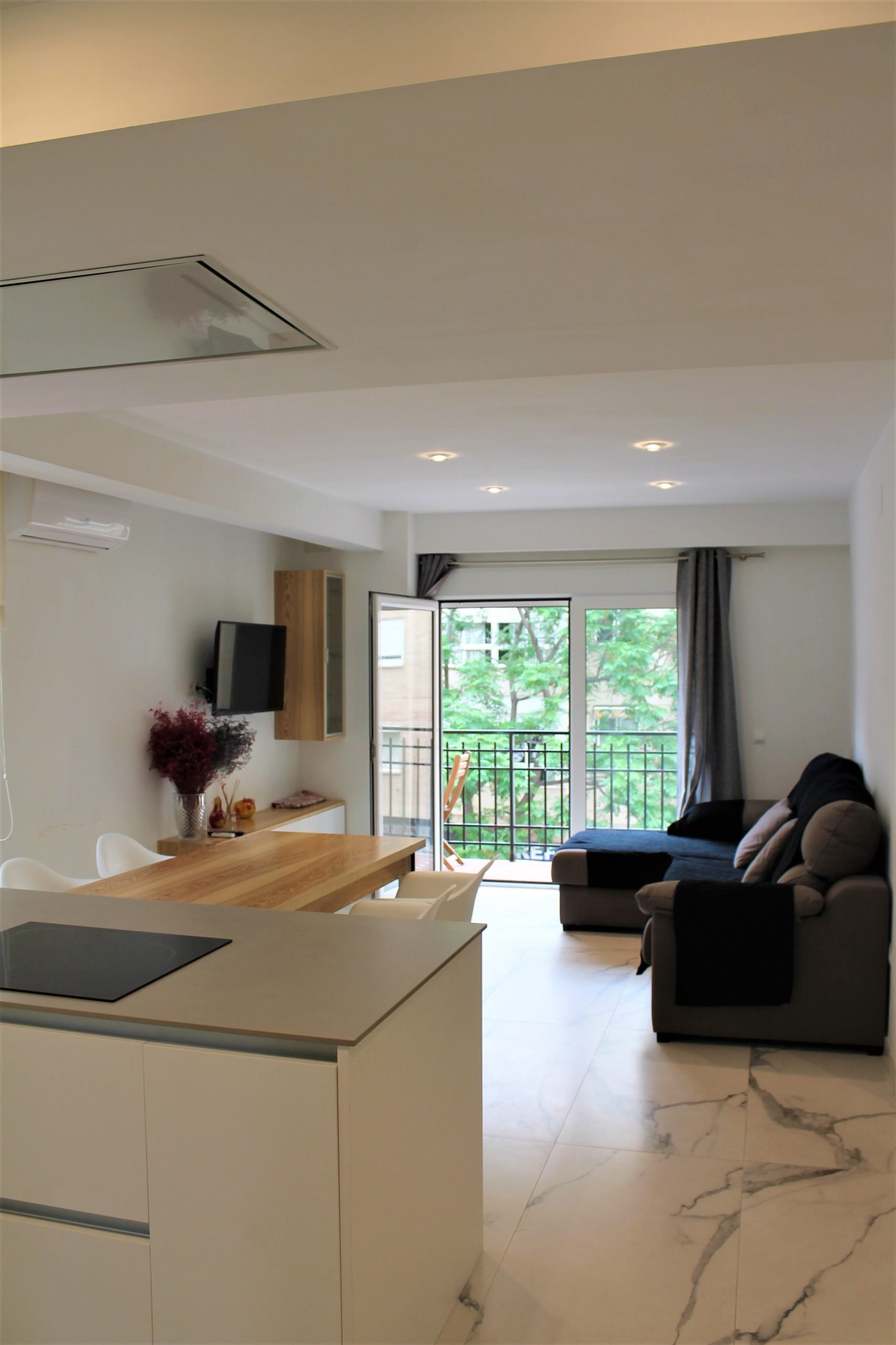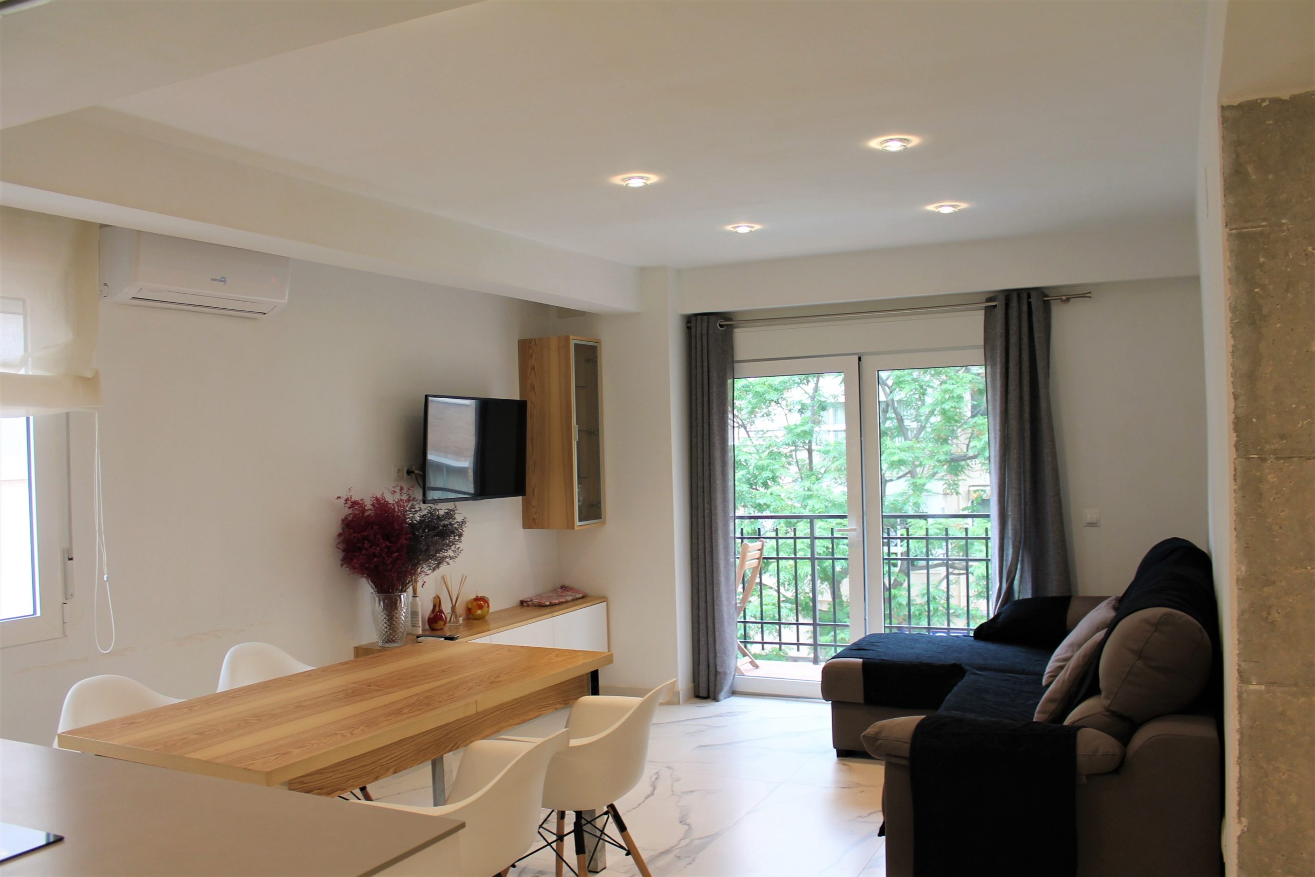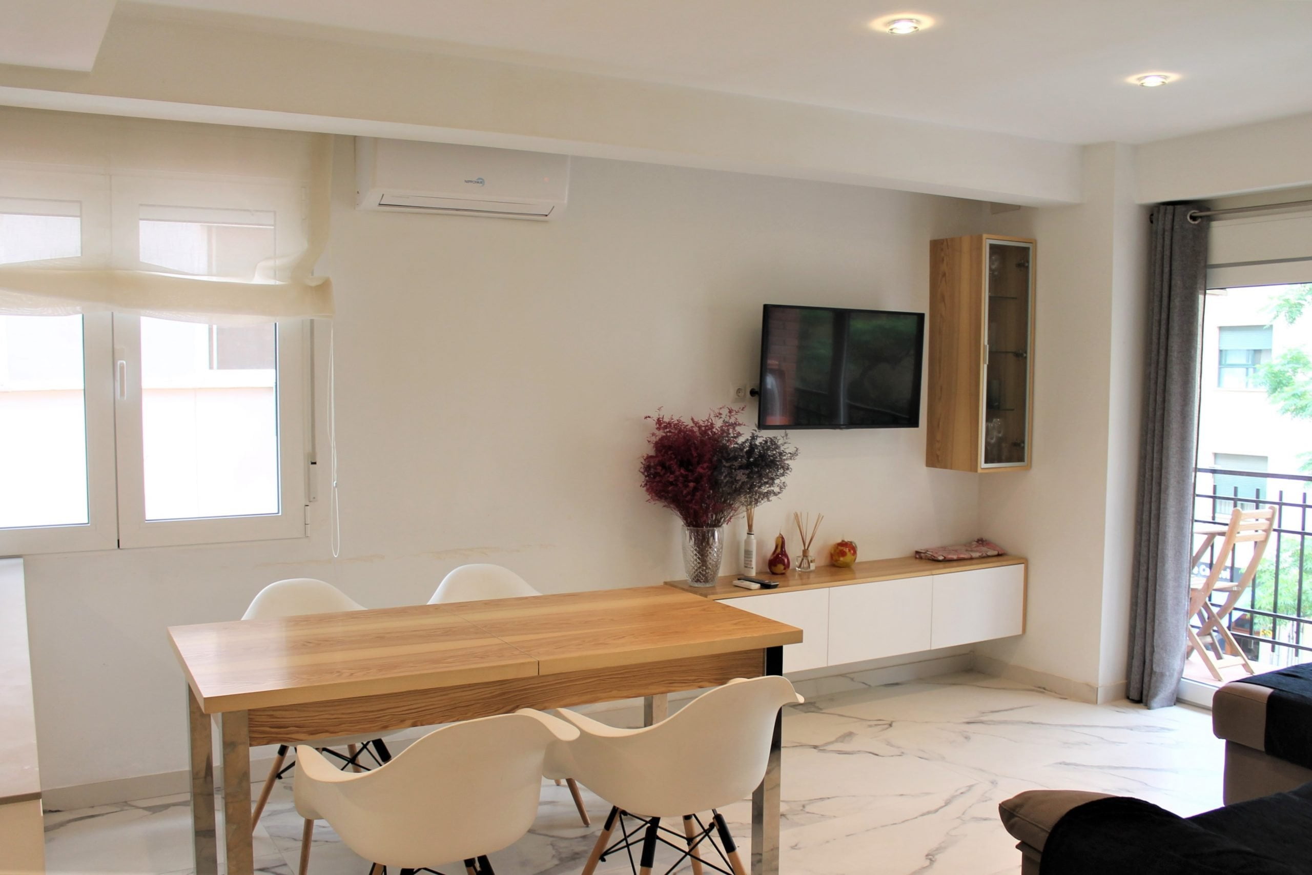 La luminosa sala de estar invita a la relajación, con un sofá cómodo y un televisor de pantalla plana, con acceso directo a un encantador balcón amueblado con una mesa y sillas, ideal para tomar un café y disfrutar del aire fresco. Con servicios esenciales como ropa de cama, toallas y WiFi de alta velocidad incluidos, este apartamento realmente encarna el hogar temporal perfecto para expatriados en Valencia.