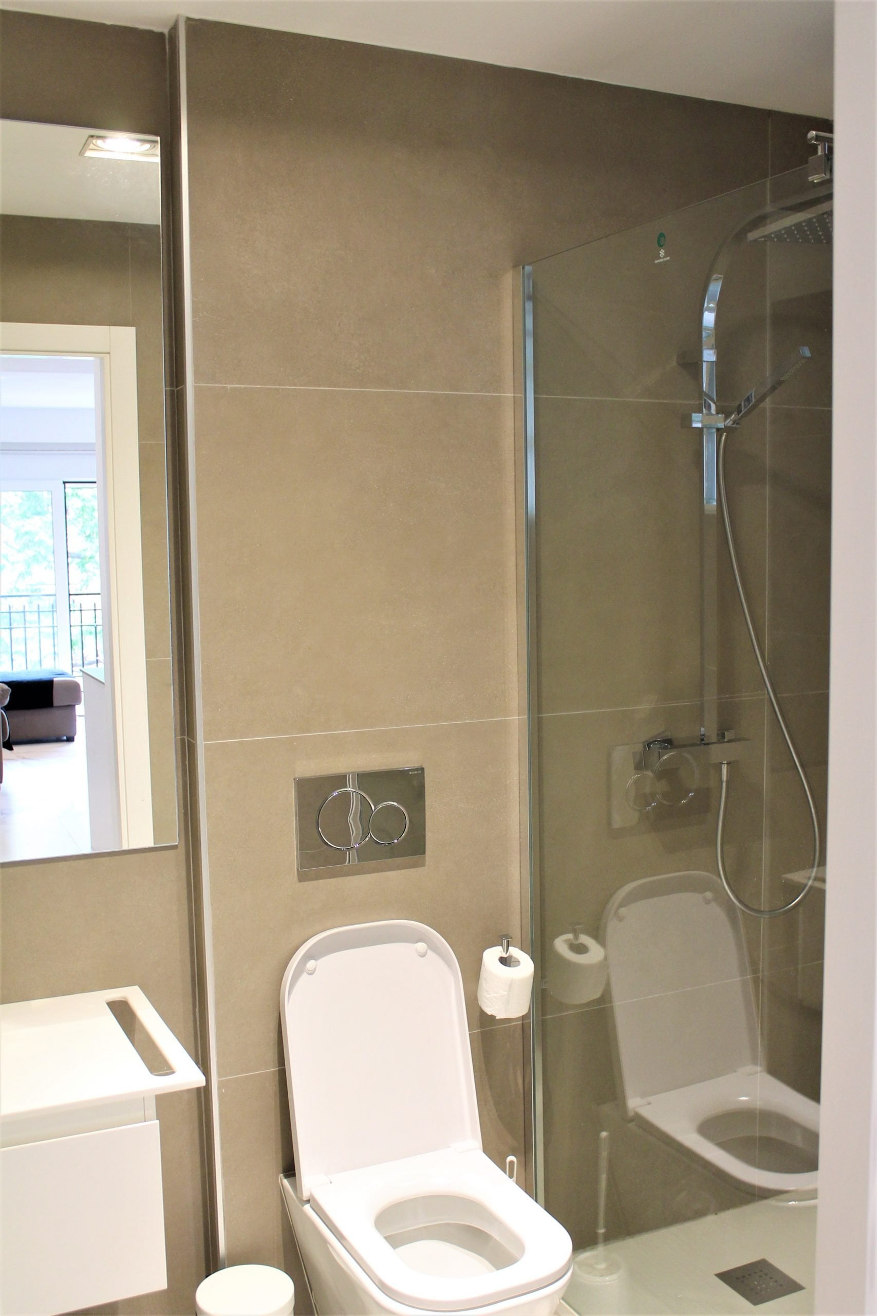 El moderno baño cuenta con una ducha a ras de suelo y un lavabo, complementado por un inodoro separado adicional para mayor comodidad. La cocina de planta abierta está completamente equipada, proporcionando todo lo que necesitas para preparar deliciosas comidas, ¡perfecto para probar algunas recetas tradicionales españolas! Disfruta de tus creaciones culinarias en la mesa del comedor, que acomoda cómodamente a cuatro.