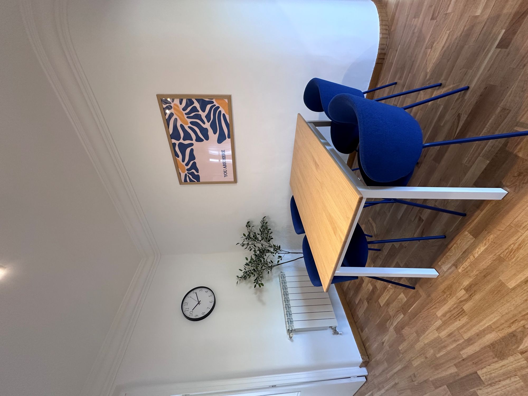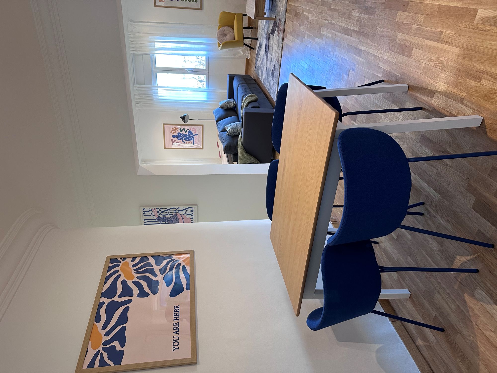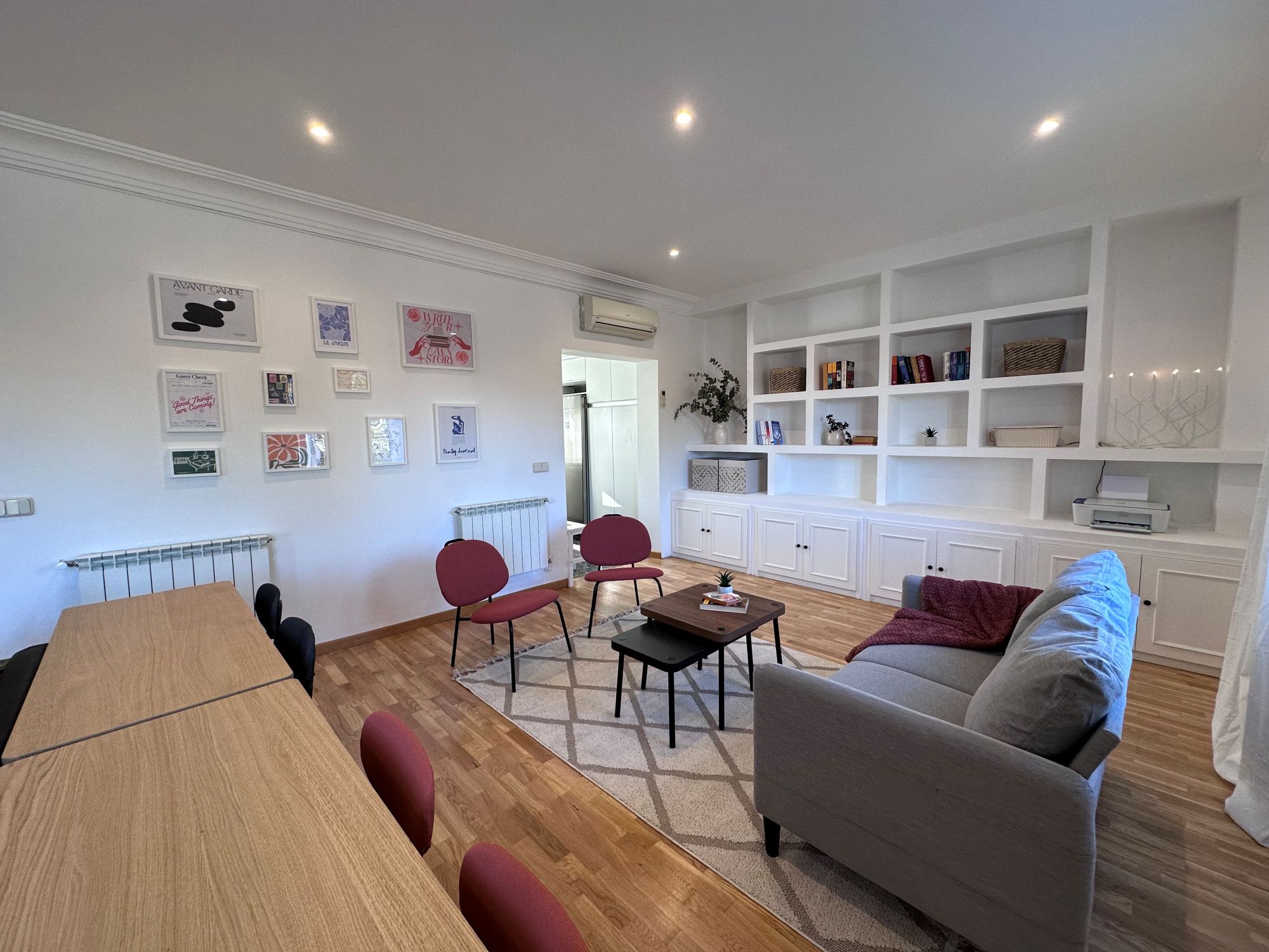 El espacio de coworking, con grandes ventanas que aportan mucha luz natural, incluye una gran mesa con enchufes para cargar tus dispositivos y sillas con ruedas. También hay café de cortesía, una zona de impresión con impresora, papel y material de oficina, y un televisor grande con cómodos sofás.