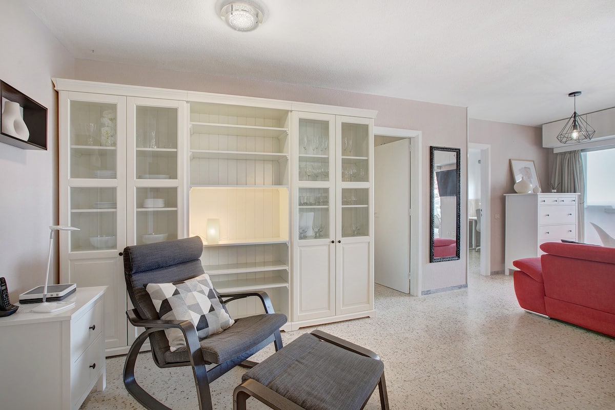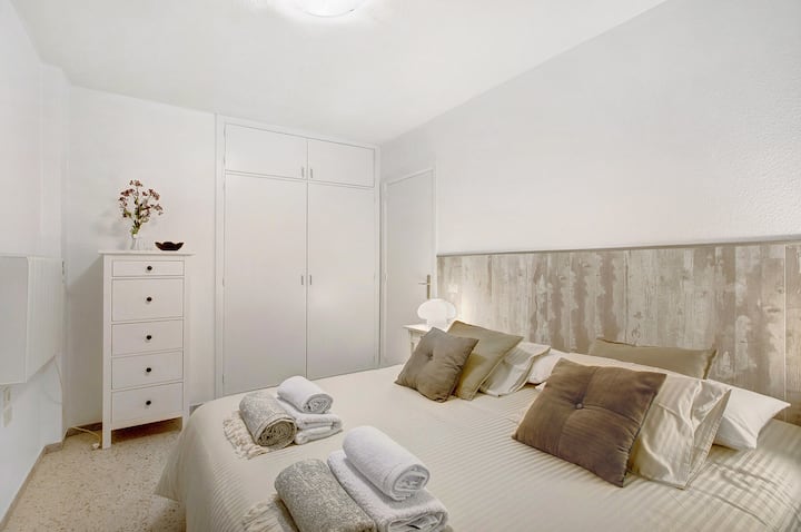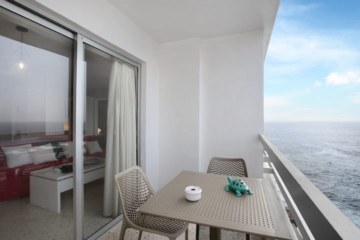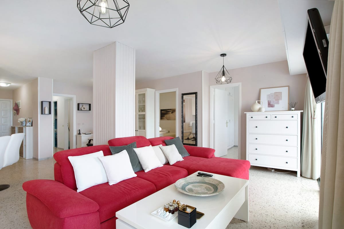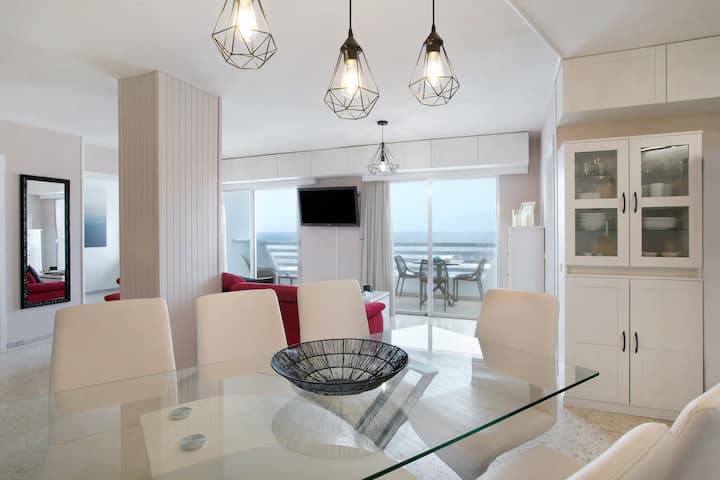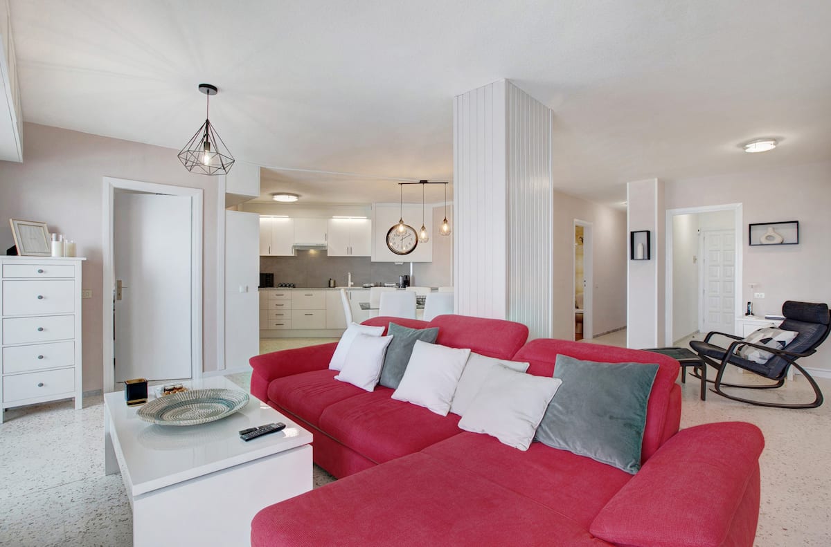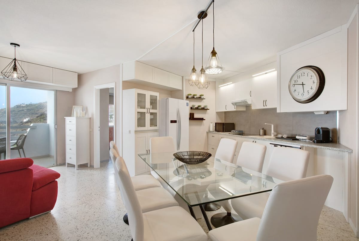 Sin embargo, la verdadera joya de este apartamento reside en sus balcones, que presentan una vista impresionante del mar. Prepárate para quedar cautivado por las impresionantes puestas de sol que pintan el horizonte. Es una característica verdaderamente notable que te dejará maravillado una y otra vez.