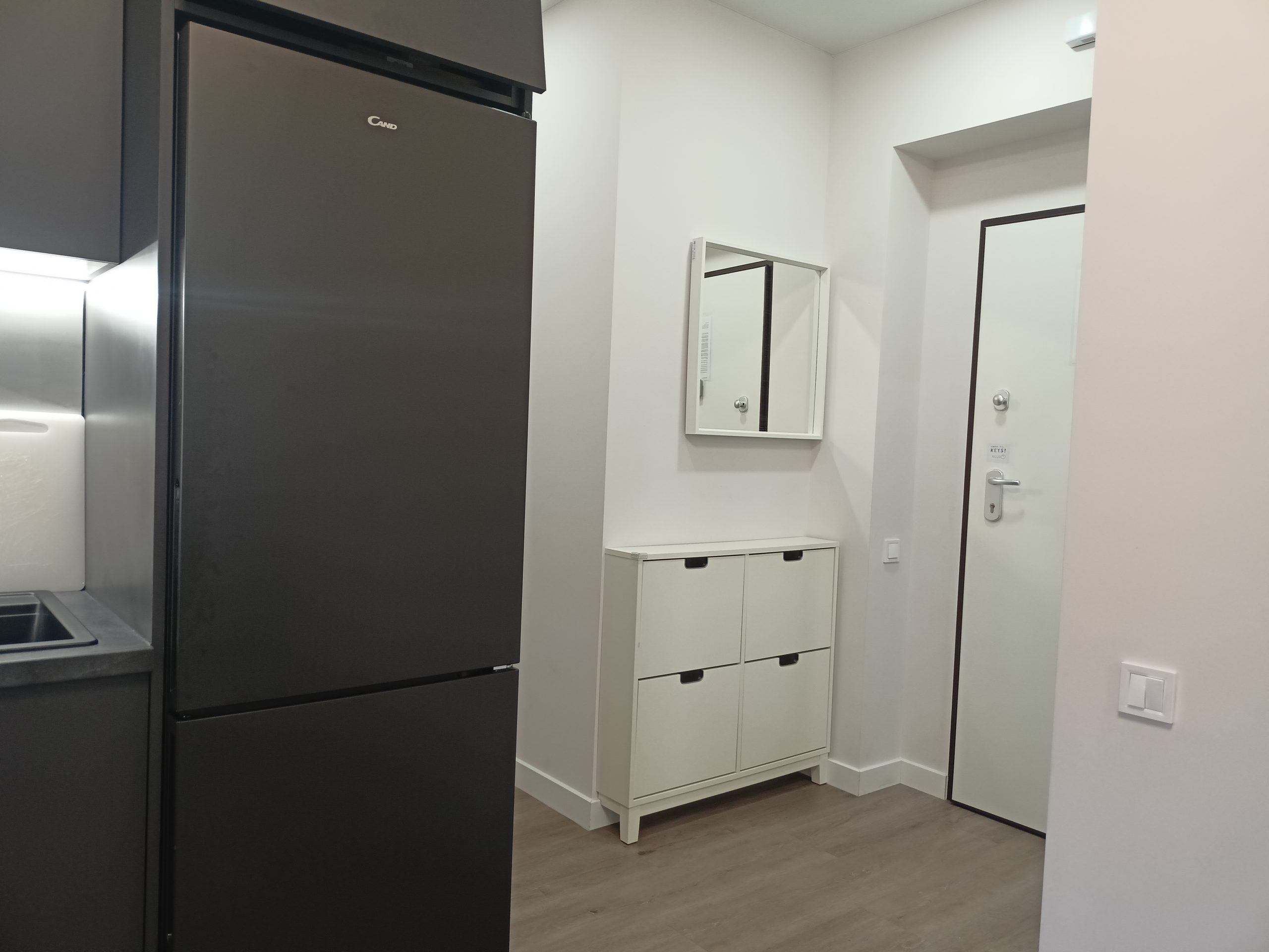 Al entrar al apartamento, los huéspedes son recibidos por un espacio de vida luminoso y aireado adornado con muebles contemporáneos. La sala de estar cuenta con suelos de madera pulida y una gran cantidad de luz natural que entra a través de las ventanas grandes, creando una atmósfera cálida y acogedora. Relájate en el cómodo sofá, que también se convierte en una cama confortable para los invitados ocasionales, mientras disfrutas de la brisa refrescante del balcón ubicado a pocos pasos de distancia.