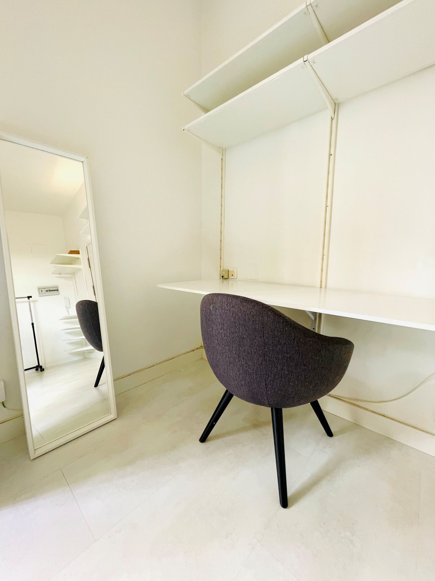 Convenientemente ubicada detrás del sofá, encontrarás una espaciosa estación de trabajo. Tendrás mucho espacio en el escritorio para terminar cualquier proyecto en el que estés trabajando. Junto al escritorio y el sofá, están las grandes puertas de cristal que te permiten acceder a un balcón íntimo. La moderna cocina abierta está equipada con todos los electrodomésticos y utensilios necesarios para cualquier tipo de cocina. El diseño se integra perfectamente con el resto del espacio. La cocina también incorpora una acogedora mesa de comedor con dos sillas.